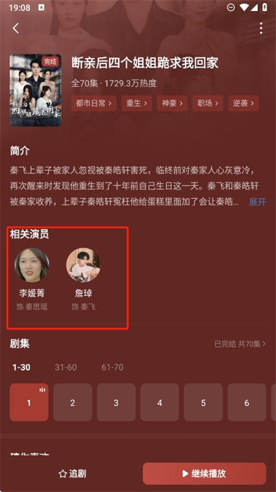 4、进入后就可以看到相关的演员信息,不仅能够看到演员的饰演者还能看到短剧中饰演的谁。