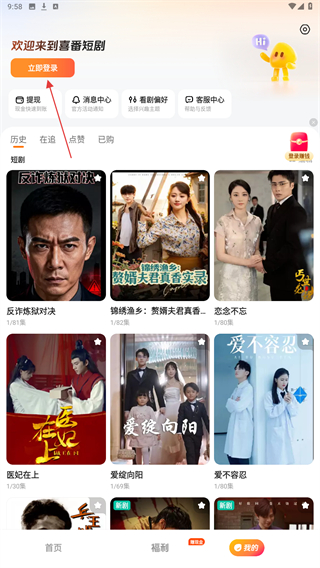 1、启动喜番短剧的APP,在首页导航栏点击我的。