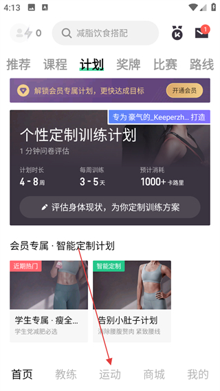 1、打开Keep APP,点击底部运动选项。
