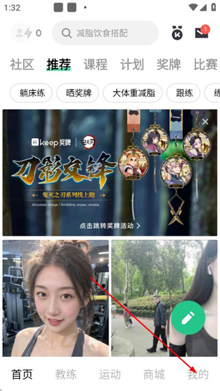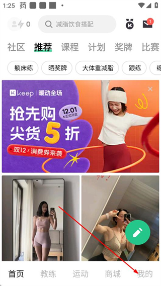 1、打开Keep应用,在首页点击底部导航栏的我的选项。