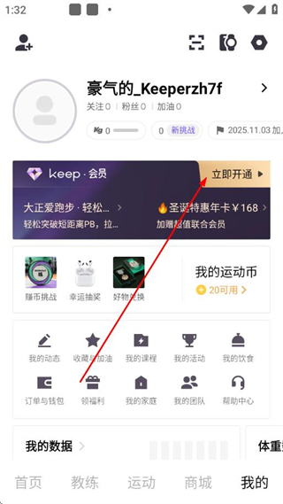 2、进入“我的”页面后,点击keep·会员板块的立即开通。