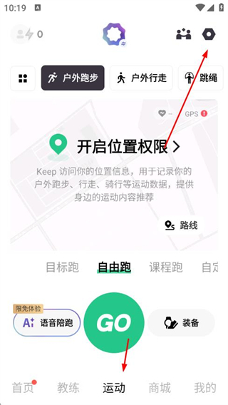 1、打开Keep APP,在运动页面点击右上角的设置图标,进入跑步设置页面。