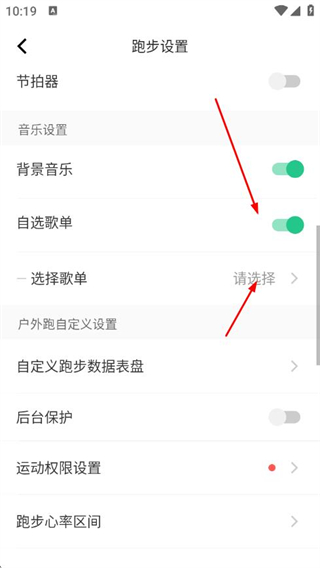 2、在跑步设置页面找到自选歌单选项开启,点击选择歌单。