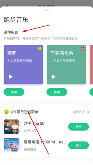 3、在跑步音乐页面选择喜欢的在线歌单,点击使用,即可完成自选歌单设置。