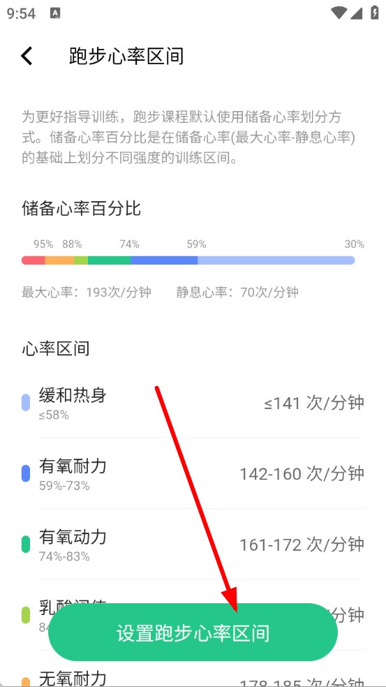 2、在跑步心率区间页面,点击下方设置跑步心率区间按钮。