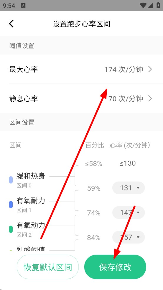 3、进入设置页面后,可按需修改最大心率、静息心率等数值,点击保存修改,即可完成心率提醒设置。