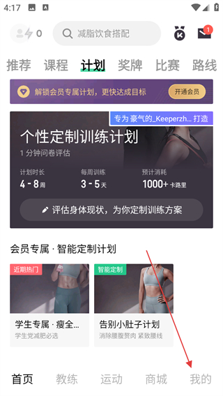 1、打开Keep APP,点击底部我的选项。