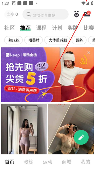 1、打开Keep首页,点击右上角的消息图标,进入消息页面。