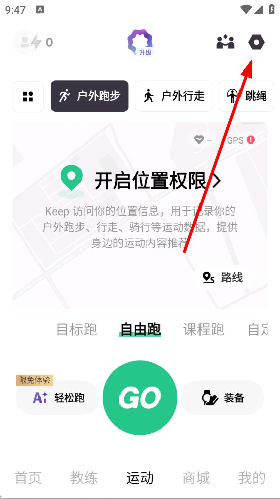1、打开KeepAPP,点击右上角设置图标,进入跑步设置界面。
