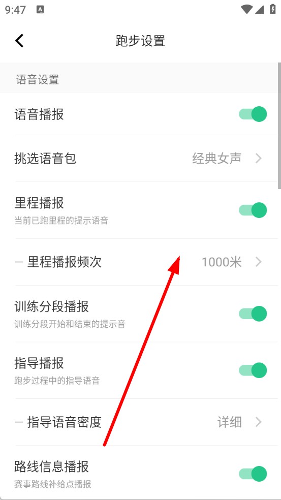 2、在跑步设置里,找到「里程播报频次」选项并点击。
