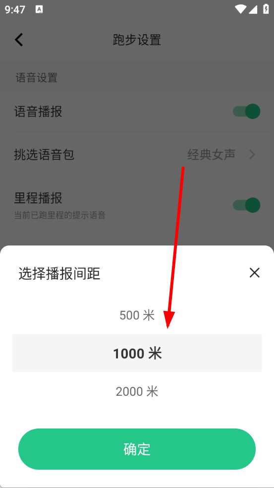 3、在弹出的选择播报间距窗口,选500米、1000米等想要的频率,点击「确定」完成设置。