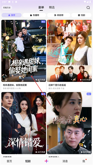 「热门短剧任意看」丰富精彩的短剧资源,家庭情感、现言甜宠、都市逆袭、古风言情等多种题材短剧每日上新,满足你多样的看剧偏好。