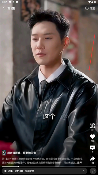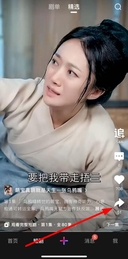 2、在短剧播放页面,点击右侧的分享按钮箭头指向图标。