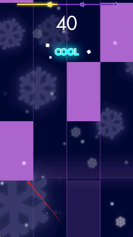 1、进入游戏,观察屏幕上紫色方块下落,当方块到达判定线时,点击方块,获取分数如40,出现COOL判定。