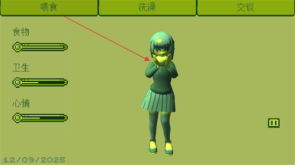 4、持续关注女孩的需求,对应操作洗澡交谈,维持她的食物、卫生、心情进度条,推进互动流程。