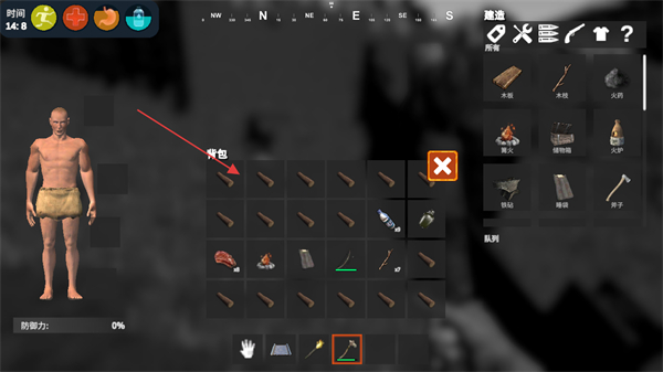 2、打开背包界面,查看已收集的资源如木头、工具,管理物资库存。