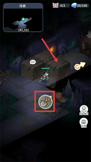 3、利用【铲子】破坏岩石,解锁新探索区域,继续深入古墓探险。