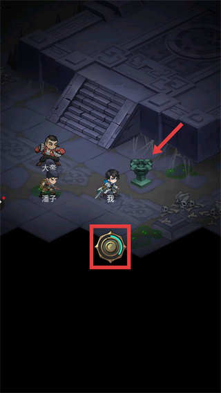 4、靠近绿色机关,点击下方按钮,与大奎、潘子等伙伴协作触发机关,解锁后续古墓剧情和探索区域。