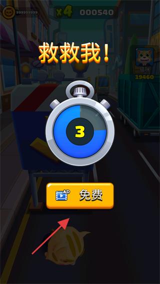 4、触发“救救我!”提示时,点击“免费”按钮观看广告,即可复活小猫继续跑酷,避免游戏结束。