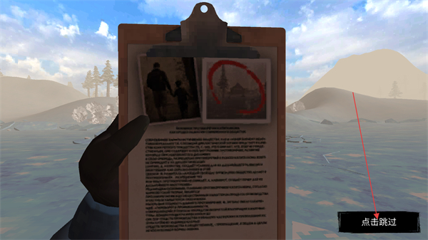1、界面显示带图文的记录板时,点击【点击跳过】按钮,可快速略过剧情内容,进入实际生存操作环节。