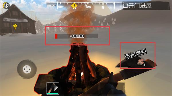 2、看到炉火旁的【添加燃料!】提示后,消耗木材为炉火添柴,维持生存所需温度,需要注意燃火的剩余时间。
