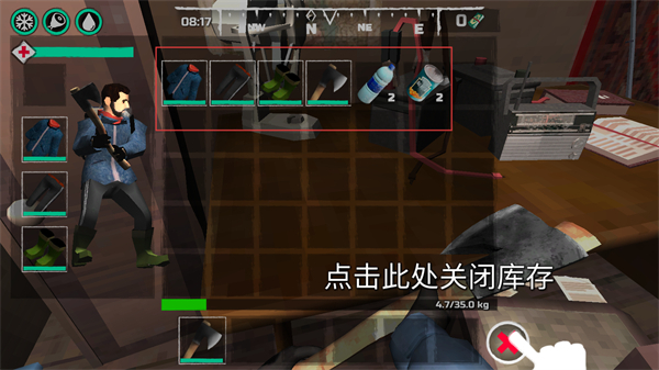 4、打开库存界面查看已收集物资,完成查看后点击关闭库存,关闭界面继续后续操作。