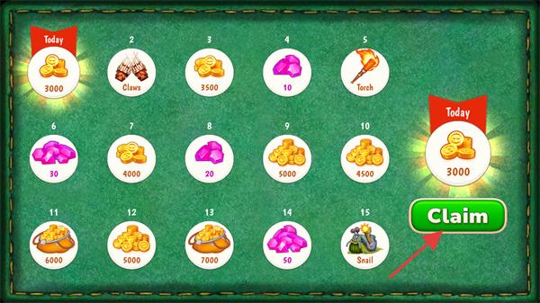 4、在每日奖励界面点击【Claim】按钮,领取今日对应的【3000】金币奖励,积累游戏资源。