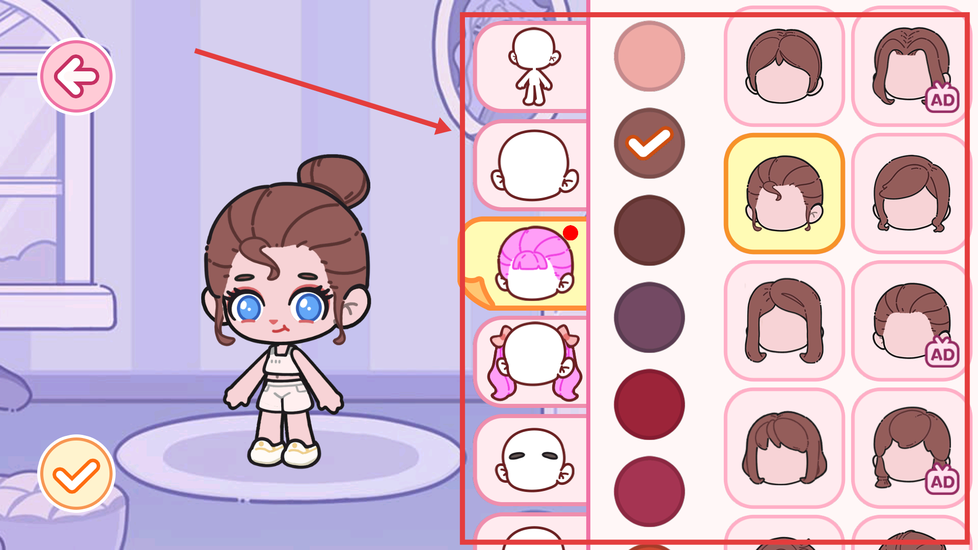3、在装扮界面选择左侧分类(如发型),再选定右侧对应的样式(如棕色发型),即可更换角色装扮元素。