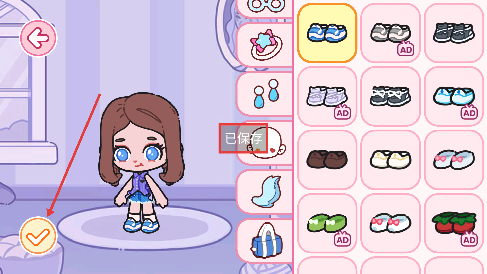 4、完成装扮选择后,点击左下角确认按钮,系统会提示【已保存】,完成本次角色装扮的设置。