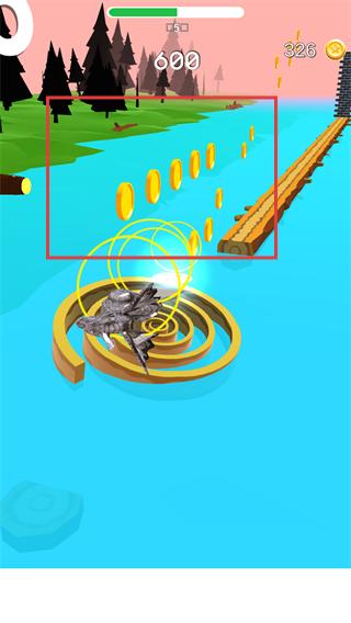 1、操控工具收集沿途金币,同时触发金色道具的增益效果,快速积累分数至【600】,金币数达【326】。