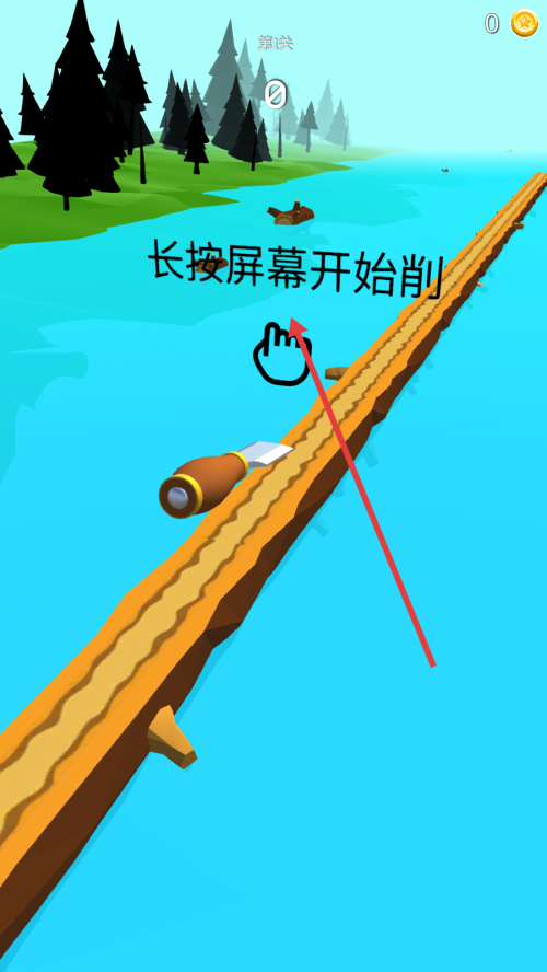 1、进入游戏后,看到【长按屏幕开始削】提示,长按屏幕操控工具,开启削木头的操作,推进游戏进程。