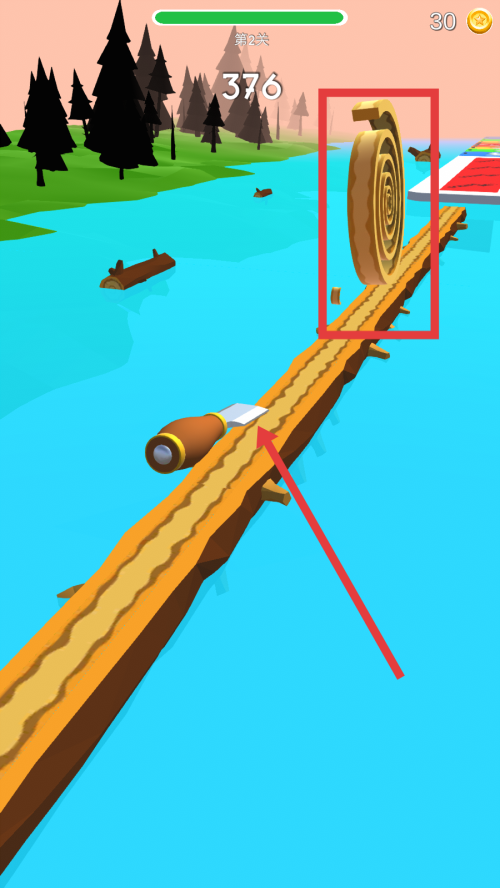3、到第2关,面对较大的木头,仍需操控工具持续削,朝着目标形状努力,不断获取分数,提升关卡进度。