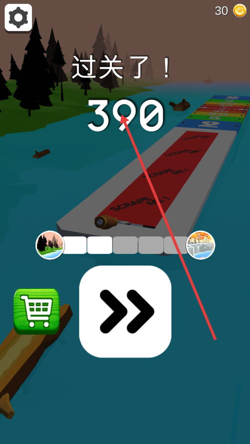 4、成功过关后,会看到【过关了!-390】的提示,此时可点击箭头按钮,进入下一关继续挑战。