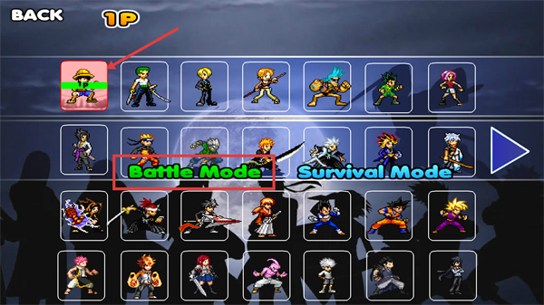 3、角色选择界面红框选中首个角色,点击【Battle-Mode】为对战模式。