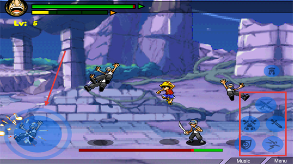 4、红框标注右侧技能按钮,操控左侧摇杆配合技能击败敌人推进战斗进程。