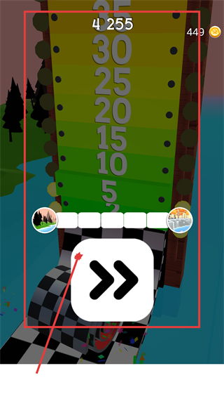 4、关卡完成后显示分数【4255】,点击被框选的箭头按钮,进入下一关继续挑战,积累更多金币与分数。