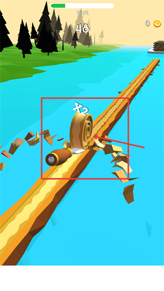 2、切削木板时,收集被框选区域的加分道具(显示+2),提升当前分数(如48),同时持续推进木板切削进度。
