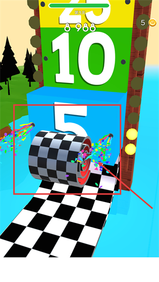 3、接近终点时,切削对应区域触发彩带动效,完成木板加工并达成关卡目标,最终分数会显示为8988等数值。