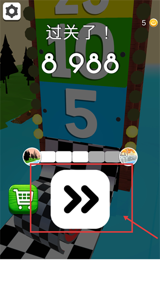 4、关卡完成后显示“过关了!”提示,点击被框选的箭头按钮,可进入下一关继续挑战,积累更多金币与分数。