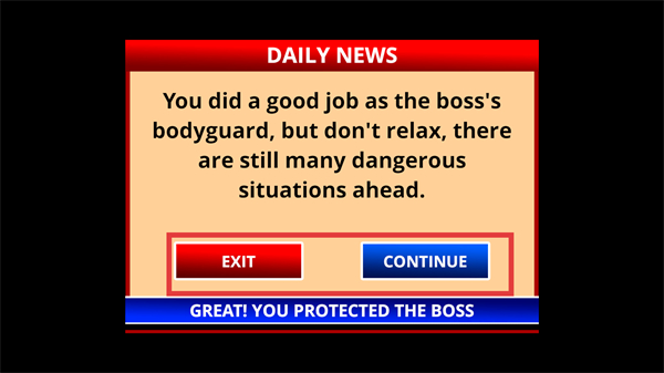 4、完成当前任务后,在新闻提示界面选择【CONTINUE】按钮,进入下一个危险场景继续执行保镖任务。