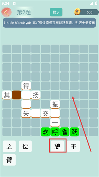 2、答题过程中,答题区已拼出绿色的,红框标注备选字“貌”,箭头指向答题区空位。