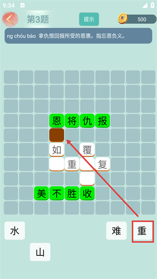 3、答题完成,答题区拼出绿色的成语。