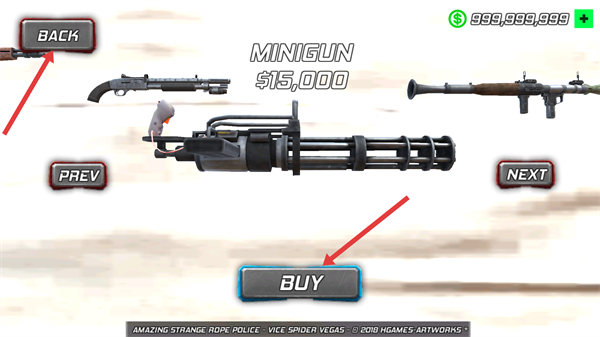 2、在武器界面选中【MINIGUN】,消耗【$15,000】点击【BUY】按钮,购买该武器后,点击【BACK】回到主界面。