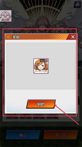 4、关卡通关后弹出【奖励】界面,获得【Lv.1】角色道具,点击【好的】按钮即可领取奖励并继续。