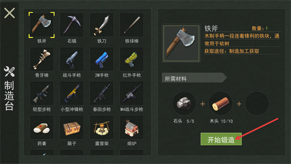 1、在制造台选择【铁斧】,集齐材料后,点击【开始锻造】获取该工具。