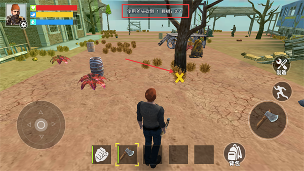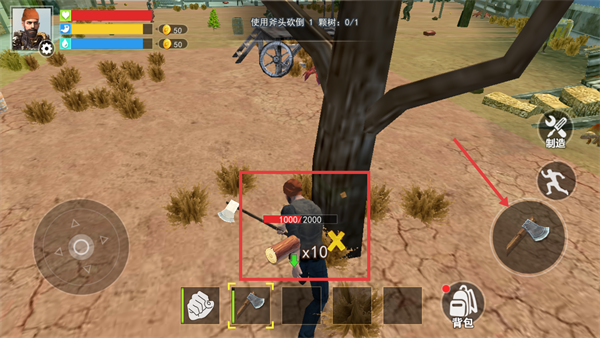 3、对树木使用铁斧,攻击红框内目标直至其资源条清空,可获得生存物资。
