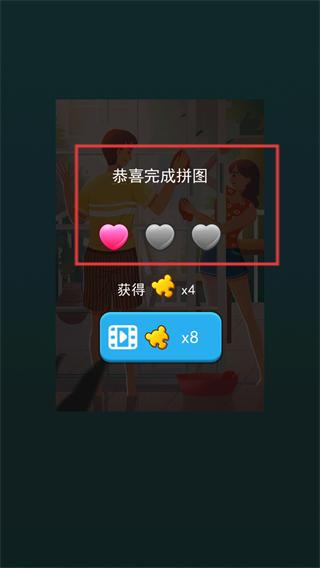 4、完成所有拼图后,获得【恭喜完成拼图】的反馈,领取对应的爱心与金币奖励,进入下一关。