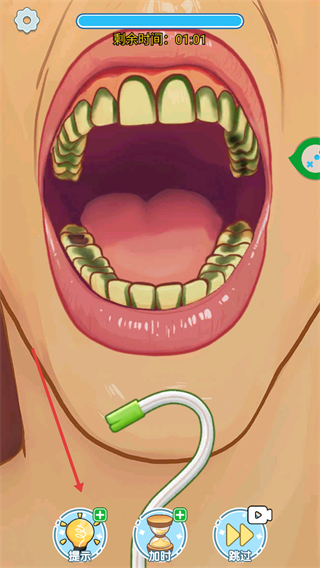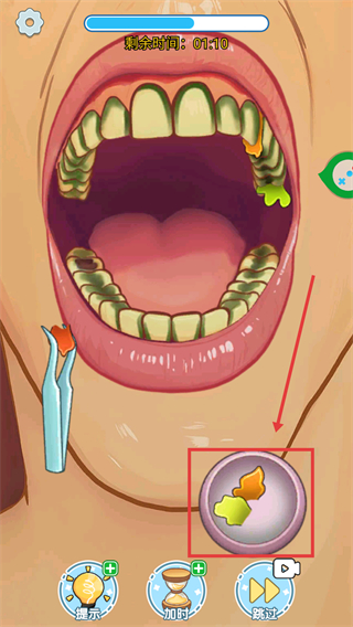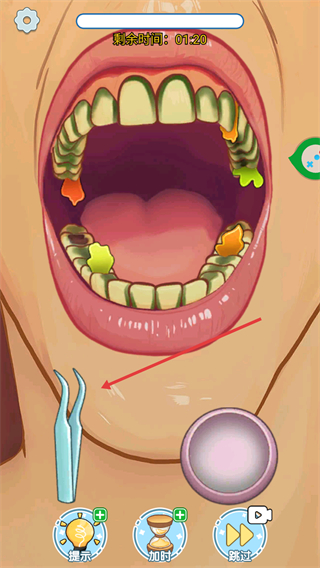 1、进入关卡后先关注【剩余时间-01:20】,点击界面中的【镊子】工具,准备清理牙齿上的残留异物。