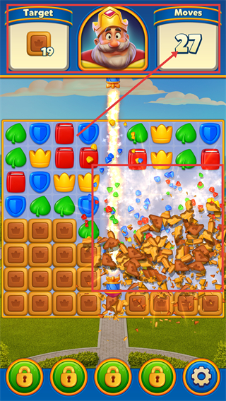 3、使用道具后会消耗步数(当前剩余【27】步),同时触发大范围消除,可快速降低目标剩余数量。