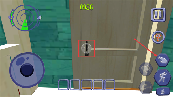 4、对准【门锁】区域,使用右侧【交互按钮】尝试解锁,完成后即可打开房门进入建筑。